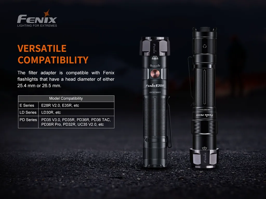 - Compatible with Fenix flashlights: E28R V2.0, E35R, LD30R, PD35 V3.0, PD35R, PD36R, PD36R TAC, PD36R Pro, PD32R, UC35 V2.0.
